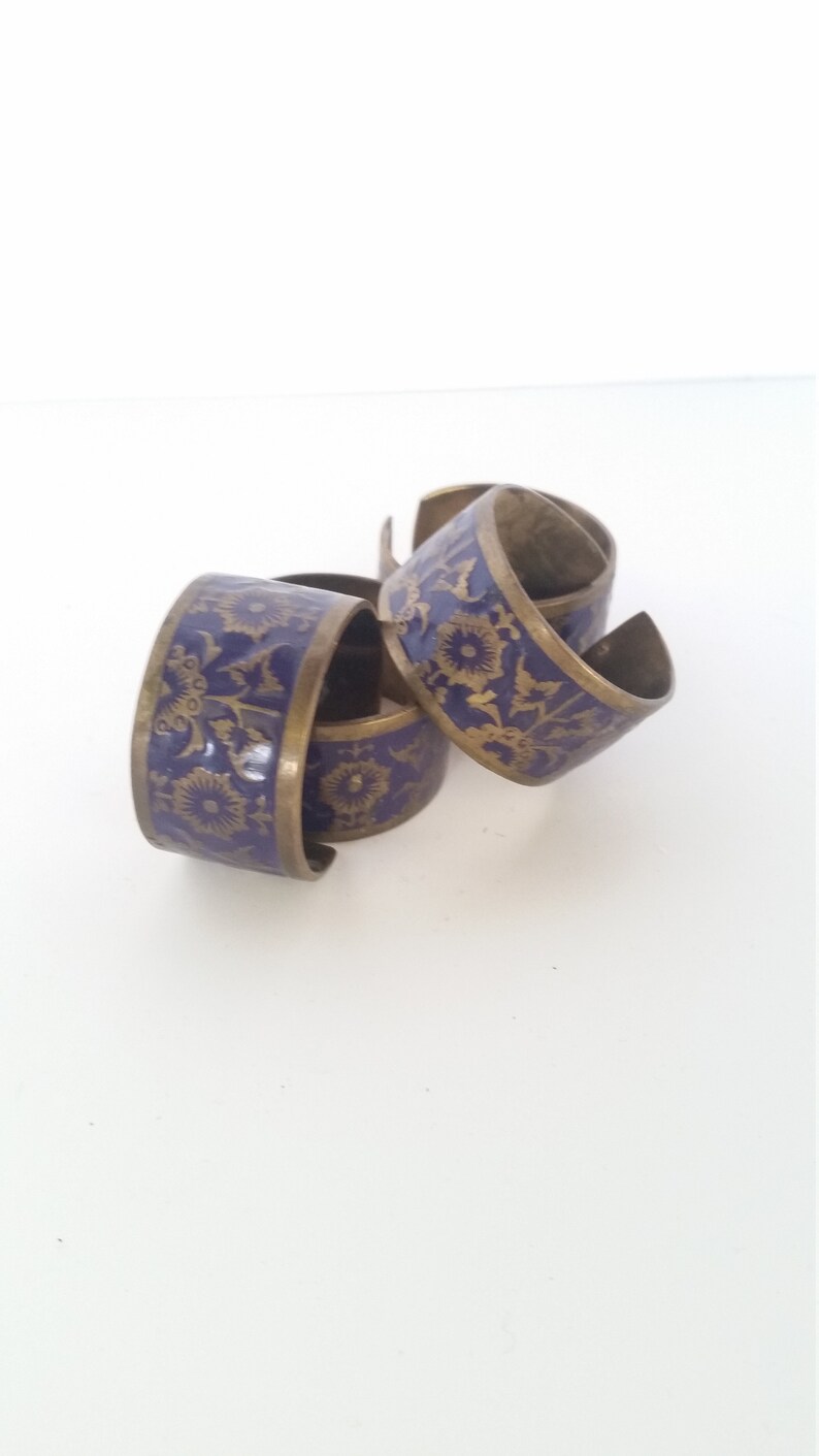 4 Vintage Brass And Cobalt Blue Enameled Napkin Rings