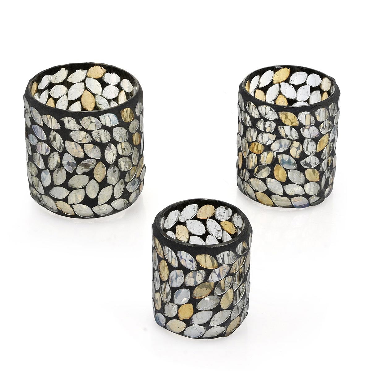 Set Of 3 Gray And Champagne Mosaic Leaf Pattern Tea Light Candle